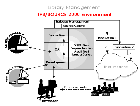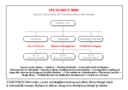 Within every library TPS/SOURCE 2000 ensures the integrity of production releases by keeping development separate from production. For development, it uses a single source code repository to support multiple versions of source code and their variants across multiple hardware architectures and operating systems. It also preserves each version so any changes can be backed out easily, or versions can be compared for differences, or versions can be replicated. For production, TPS/SOURCE enforces standards, and it builds, "freezes," and runs production releases. It emphasizes security and accountability too. It tightens security through access levels, and by constructing a comprehensive audit trail, it tracks every change to the software and labels it with the author's name, time stamp, and release tag for reference.
